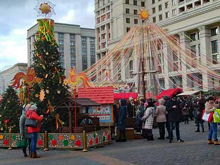 ノーヴィー・アルバート通り(かつてのカリーニン通り)をそのまま郊外方向へ進むと、モスクワ川を越えてからこのクトゥーゾフ大通りになる。右の写真は、その歩道のやや広い所にされていたマースレニッツァの飾り付け。 (2019年3月撮影)