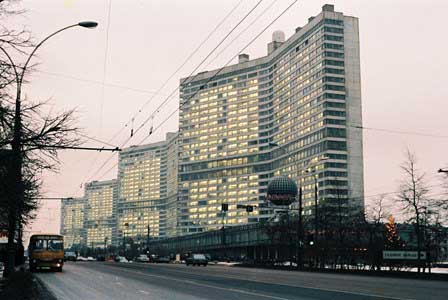 モスクワのもう一つの有名な繁華街ノーヴィイ・アルバート通り(旧カリーニン通り)。屏風を立てたような形のビル群が特徴的。 (1985年12月撮影)