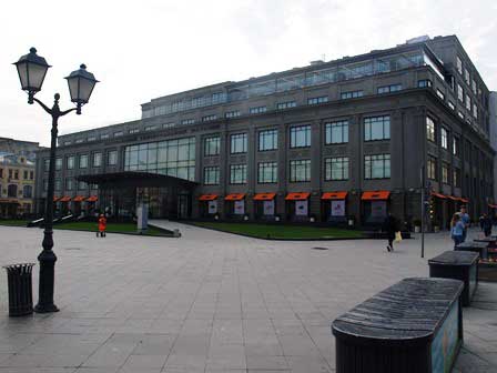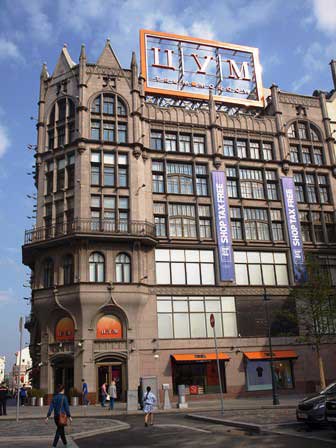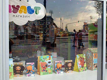 これもソ連時代からある有名な百貨店。こども用品専門の店で、店名は「こどもの世界」という意味。ショーウィンドウのガラスにお店の外の様子が映っている。 (2018年8月撮影)