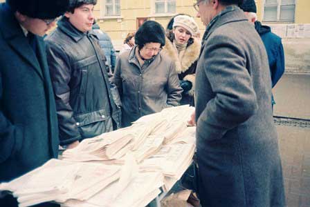 M・S・ゴルバチョフの提唱した「ペレストロイカ」は外国人旅行者の目にも見える様々な変化をソ連社会にもたらした。それまでにくらべれば言論は大幅に自由化され、街では自分達の主張を掲げた新聞売りが思い思いの場所で購読をよびかける光景も見られるようなり、そのような場所ではよく賛成・反対の両派が議論しあったりしていたものだった。 (いずれも1990年12月撮影)