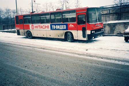 ソ連の交通機関は車体にも車内にも広告というものを載せていなかったが、この頃から市電やバスはしだいに宣伝カーの様相を呈してきた。これは私がモスクワで初めて見た日本企業の広告。それから数年を経た時には、日系の多国籍企業Fフィルムの広告なんかロシアのどんな片田舎へ行っても必ず見ることができるほどになっていた。