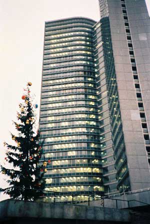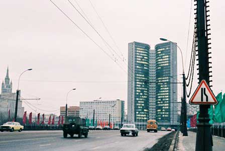 本のページを開いたようなユニークな形のビルには、かつて“社会主義”諸国の経済関係を調整するために設けられた経済相互援助会議の本部が置かれていた。 (1985年12月撮影)