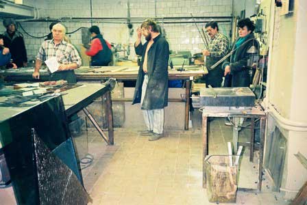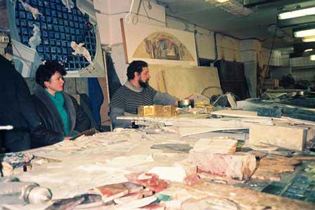 ロシアの人たちは様々な色のついた美しい石を珍重し、それらに巧みな細工をほどこす。地下鉄駅の飾り文字なども石細工でできていることがある。もちろん教会の内装などにも。写真は、都市の装飾のための石細工の工場。 (1990年12月撮影)
