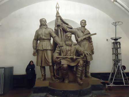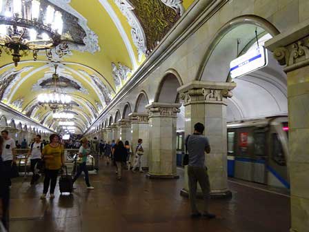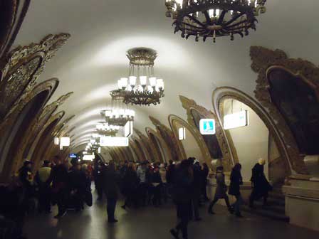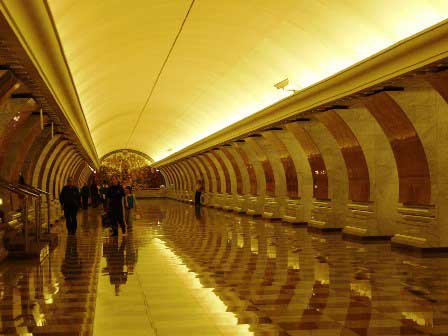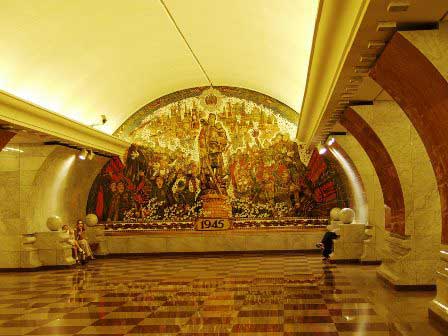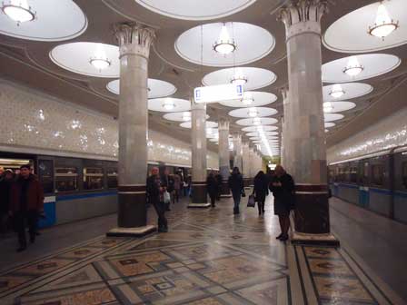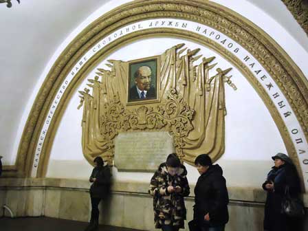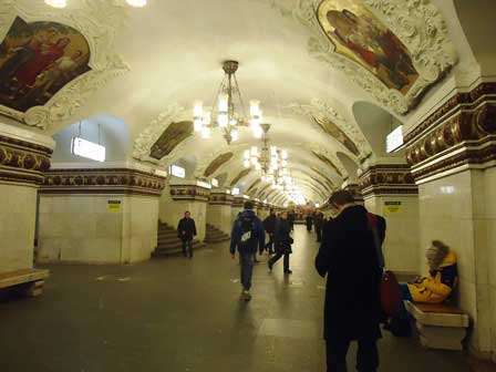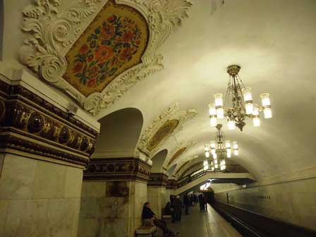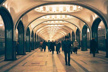 モスクワの地下鉄は、その各駅の装飾の見事なのがご自慢で、以前は市内観光の中に地下鉄見学というのが必ず含まれていた。ガイド氏から5カペイカ玉を1つ貰って改札機を通り、各駅でホームに降りてはモザイクや彫刻を見学して歩くというものである。左の写真はマヤコフスカヤ駅。 (1985年12月撮影)