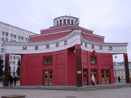 2段目の左側2枚は比較的最近延伸された線の新駅。地下鉄駅を美術的に飾るという伝統はそのまま受け継がれている。もっぱら機能性だけで設計するというどこかの国の地下鉄駅とは違う。 (2003年8月撮影) 2段目右の写真は、ベラルスカヤ駅に置かれた彫像。傍らの人の比べると、その巨大さがわかる。 (2014年12月撮影)(3〜5段目:2016年3月撮影,ただし5段目右のみ2017年8月撮影)