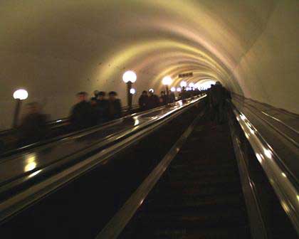 駅の位置がわりに深く、そたのためにエスカレータの距離が長いのもモスクワの地下鉄の特徴。日本のに比べるとかなり高速だが、それでもエスカレータ上にいる時間が長いので、二人連れのうちの前の一人が後ろを向いて会話する光景は珍しくもなく、まれには若い男女がかなりの時間しっかり抱擁しあっていても降り口に着いてしまって転倒などという事態には至らない。 (最下段:2001年1月撮影)前のページへ 次のページへ 目次へ戻る