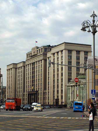 クレムリンのすぐ近くにあり、かつては「労働組合会館」と呼ばれた建物で、ブレジネフなどソ連の最高指導者が亡くなった時、葬儀の前にここに遺体を安置して弔問を受けていたような記憶があるが、もしかして私の記憶違いかもしれない。現在は、ロシア連邦の国会の下院の建物として使われている。 (2018年8月撮影)