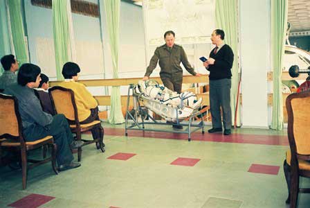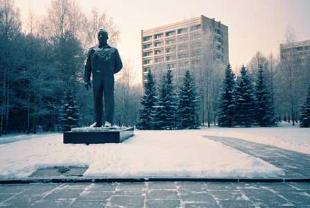 宇宙関係の技術者の住む「星の街」。左の写真中の銅像は人類初の宇宙飛行士ガガーリン。中・右の2枚は見学者用施設。 (1990年12月撮影)