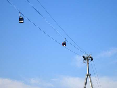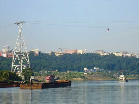 しかし、大河に橋を架けるのは容易ではない。なにしろ川幅が広い上に、大河は水運の動脈なので船が通れる高さも求められる。ここニジニ・ノヴゴロドでは、人が河の向こう側と行き来するために橋の代わりにロープウェイが設けられていた。左の写真で、河の両岸に鉄塔があるのがわかるが、これがロープウェイの支柱。かなり短い間隔で運行している。残念ながら、私は乗ったことがない。 (2014年7,8月撮影)