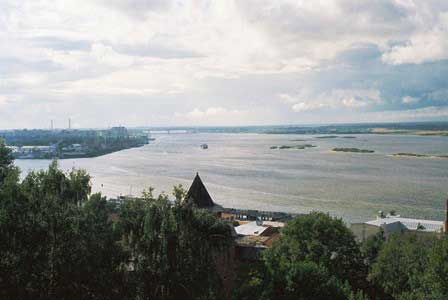 大定期市(ヤルマルカ)で知られるニジニ・ノヴゴロド。ヴォルガ川とオカ川の合流点に発達した。左の写真は川から市街を望んだところ。岸の段丘上にあるのがクレムリン。この町はソ連時代に物理学者サハロフ博士が「流刑」になっていたことでも知られる。上段右の写真は、川岸の展望台だったかクレムリンの庭園だったからか見たヴォルガ川。ガイドの説明では、画家レーピンがここから見たヴォルガがいちばん美しいと言ったとか言わなかったとか。 (上段左:2007年8月,同右:1997年8月,下段左右:2014年7月撮影)