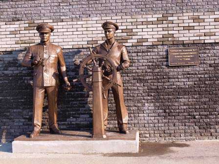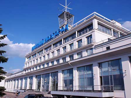 河港のターミナルビル。右下の写真は、ヴォルガの船会社130周年か何かの記念で、水運に従事する労働者を顕彰する碑。 (2014年7,8月撮影)