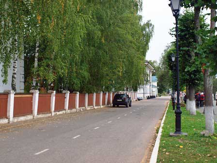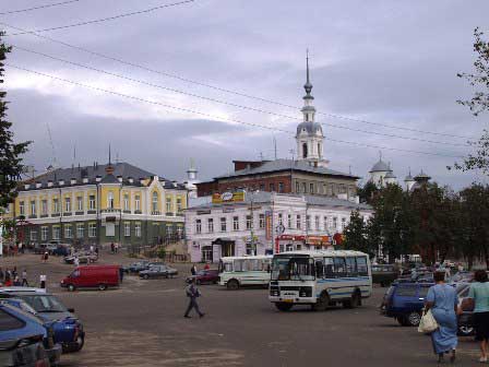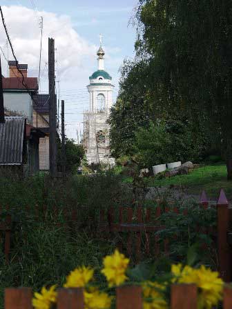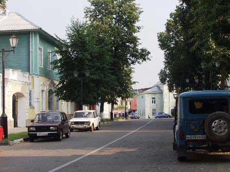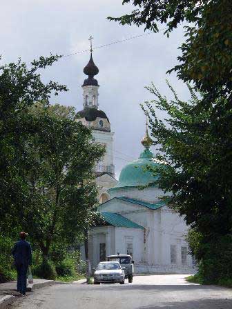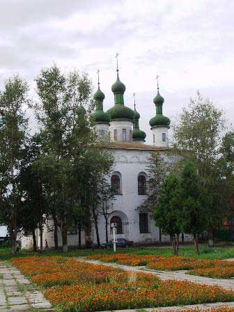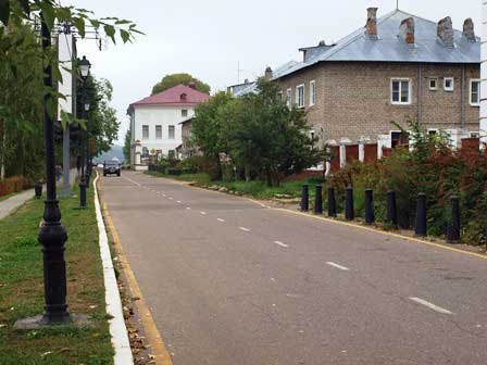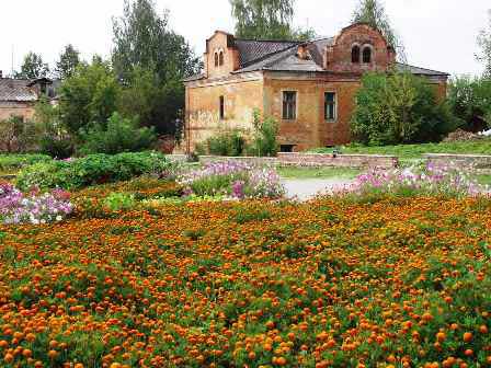 この町もロシアの多くの都市と同じように町のあちこちで花壇がよく整備されていた。左は由緒ある教会の境内。右はなんでもないごく普通の通りの一角。 (2007年8月撮影)