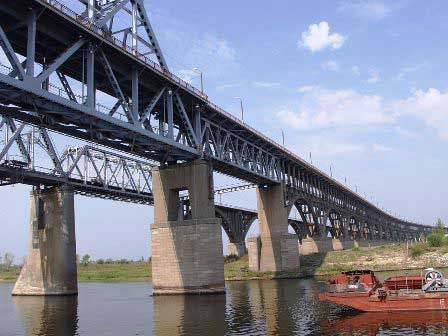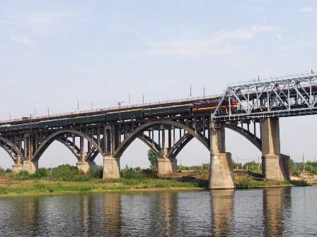 ヴォルガ河にかかる橋。上下2本の橋が架けられている上に、鉄道と道路の2層という複雑な構造。シベリア鉄道の急行「ロシア」号も現在はここを通る。 (2007年8月撮影)