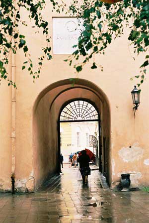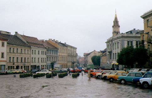 市の広場と通り。建物の屋根の形や、通りに出されたちょっとした看板のデザインでも、やはりロシアではないヨーロッパの雰囲気がどことなく伝わってくる。 (1987年8月撮影)