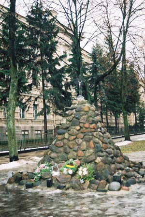 ソ連時代の弾圧犠牲者の慰霊碑か。背後の建物はかつてのKGB。現在はKGB博物館になっている。 (1998年12月撮影)