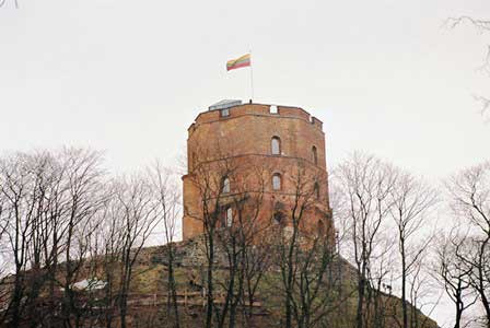 リトアニアの首都ビリニュス市中心部の小高い丘の上に立つ。かつての城壁の一部だと言われる。塔の上にはためく国旗が新生リトアニアの象徴。 (1998年12月撮影)