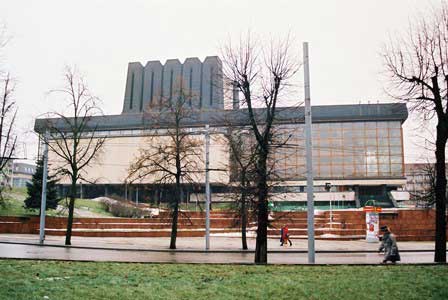 市の中心部にある劇場。98年暮れの旅行でビリニュスに着いた時、旅装を解いてすぐこのオペラ座のカッサに行ったら運よくその夜のバレエのチケットが買えた。バレエが何だったのかいまだにわからないのだが、プログラムには「GRAIKAS ZORBA」 とあり、舞台装置はエーゲ海あたりの街の風景だった。舞台の左右にかなり大編 成の合唱団がいて、私は入場したての時にはオペラだとばかり思っていた。ところがいつまでも舞台の人が誰も歌わない、それでそうだバレエだったと気づいた始末。 このバレエがどんな感じかというと、男女の群舞もソリストも動きが速く激しく、そして群舞は機械的に揃えている風ではないのに妙に調和があって安定感がある。二幕ものでそんなに長いバレエではなかったが、見終わって充実感のある作品だった。社会が大きく変わる時というのは芸術もいきいきしてくるものだが、そう思えるのは単に私の思いこみ過ぎだろうか。 この劇場そのものももいい。内壁は明らかに音響を重視した作りになっていて、椅子はマイカルの映画館ほどではないにしてもかなりそれに近いゆったりとしたもの。席はバルコンIIのセンター・ロゼだったが、ロージャと言っても一つのボックスに40人近く入れる大きなもの。ボリショイなどではその二列目以降になると相当見づらいのだが、ここは床の傾斜や椅子の配置がよく計算されていて後部でもそういうことがない。 というわけでその夜は大満足でホテルに戻ってくることができた。 (1998年12月撮影)