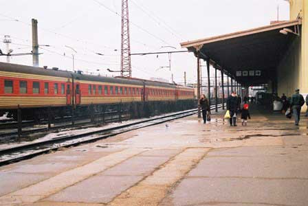 国鉄ビリニュス駅。停車している列車の塗装は日本の旧国鉄の急行用ディーゼル車両を思わせるが、車両本体は旧ソ連型のもの。あの暗緑色の塗装をすっかり変えてここでも旧ソ連からの脱皮の意図を明瞭にしている。 (1998年12月撮影)