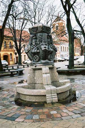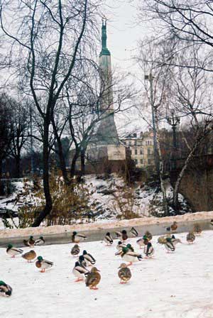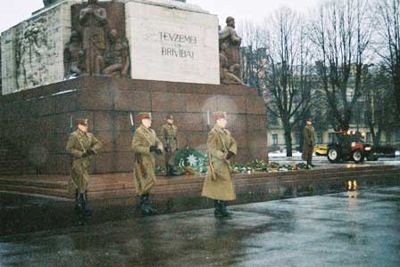 左の写真の奥のほうに見える細長の塔が1935年にラトビアの独立を記念して建てられたという自由の記念碑。中央の写真は、塔の頭部にあるミルダの像。現在、この碑の前にはラトビア軍兵士が交代で立哨にあたっているが、その交代の儀式の様子がソ連軍のそれに似ていて「あれっ」と思う。ソ連時代にはこの碑はまったく無視されていたと書いているガイド・ブックもあるが、ソ連時代に発行された絵はがきセットにも収録されており、そのあたりの事情は単純ではないようだ。 (1998年12月撮影)