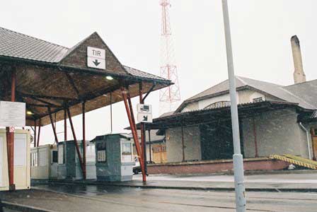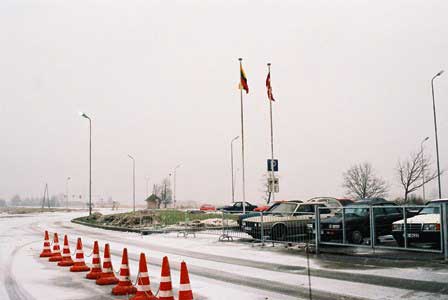ラトビア〜リトアニア国境。ソ連時代とは全く違って出入国管理のゲートがあり、その近くに両国の国旗が並び立つ。鉄道で国境越えの経験はあるが、道路でのそれは初めてだった私はこういう場で写真撮影はならぬということを知らずにこの2枚の写真を撮ったら、国境警備隊員に見とがめられてゲートに連れていかれることになった。銃殺されるとは思わなかったけれど、フィルムを抜かれるのかと覚悟したところ、乗っていた自動車の運転手氏がとりなしてくれて難を逃れることができた。 (1998年12月撮影)
