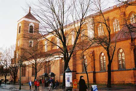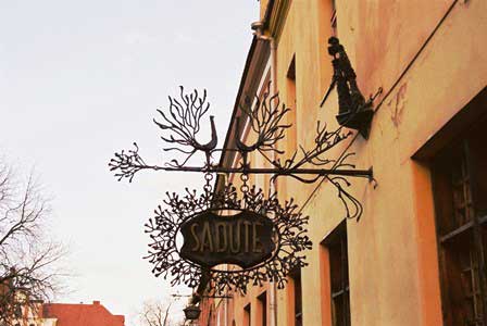 旧市街の中心、ロトゥシェス広場。夕陽に映える旧市庁舎が美しい。右端の写真の奇妙な形の石碑はナポレオンの記念碑だとガイド嬢が言っていたが、ナポレオン軍を撃退した記念碑なのだろうか。まさかナポレオンがロシアに攻め入ったことを讃えるものではないと思うが。広場に面した建物の前に下がっていた左から3枚目の写真の看板も旧ソ連のにおいのまったくしないおしゃれなもの。 (1998年12月撮影)