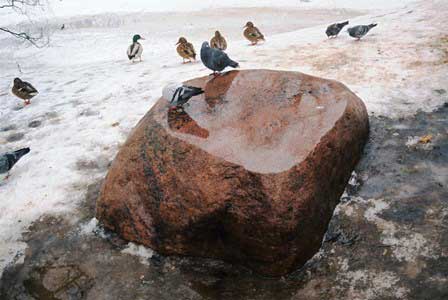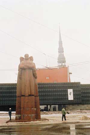 リトアニアほど激しくはなかったのかもしれないが、ラトビアでもソ連からの独立は無血で実現されたわけではなかった。自由記念碑からほど遠からぬところにある公園の小川のあたりにソ連軍部隊との衝突で亡くなった市民を追悼する石碑がいくつか置かれている。表面が濡れていたので氏名の読めない写真になってしまったが、上の平らな面に犠牲者の名前が一人ずつ刻まれている。それを読むと明らかにロシア人と思われる名前もあり、この地域の民族構成の複雑さもかいま見せている。 (1998年12月撮影)