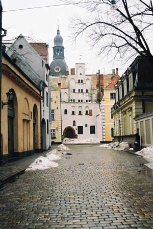 リガの旧市街を歩くとこんな石畳の道があちこちにある。 (1998年12月撮影)