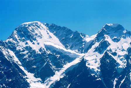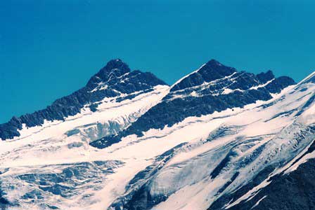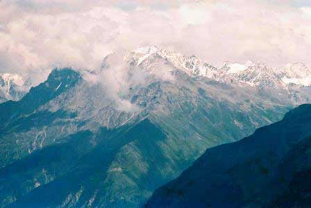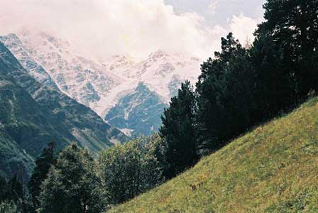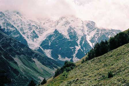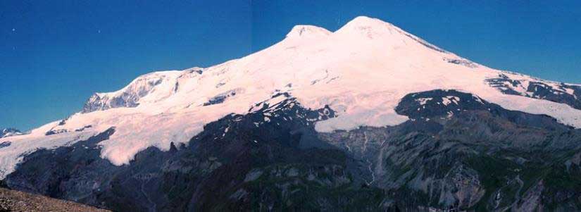 主峰エルブルスをはじめとする高山の連なるコーカサス山脈。荒々しい山肌と万年雪とで人々を寄せ付けない感がある。 (上二段:1989年8月,下二段:1984年8月撮影)