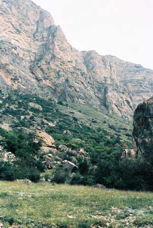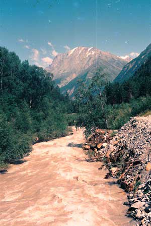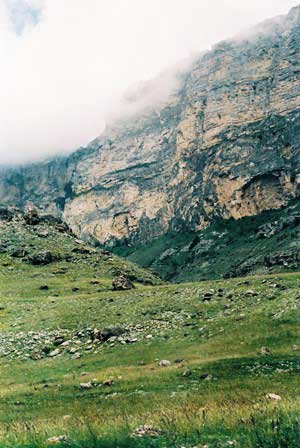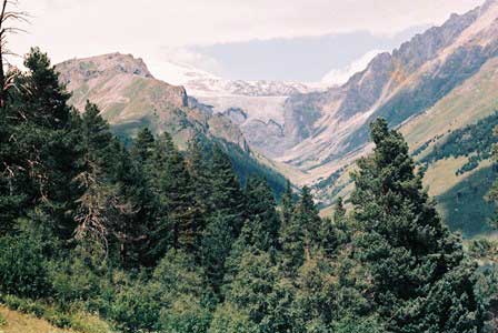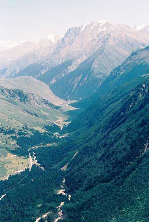 コーカサスの急峻な峰々から流れ出た雪解け水が刻む深い谷。氷河地形なども見られる。谷筋の道を車で走ると両側の壁が雲を突き破って天まで伸びているような印象を受ける。(上段左・中と下段右は1989年8月,上段右と下段左・中は1984年8月撮影)谷の入り口には変わった形のモニュメントがあった。何かの守り神?