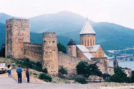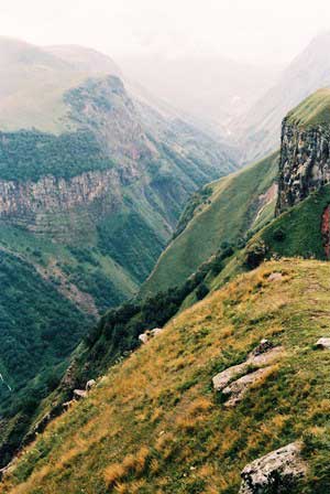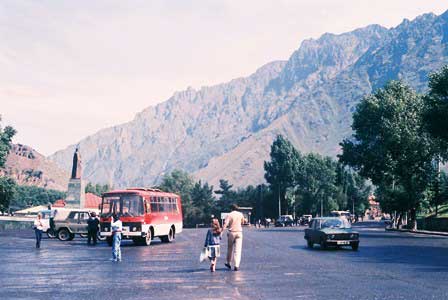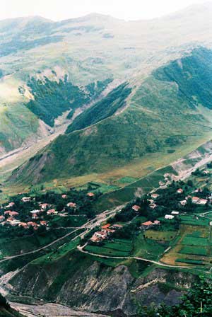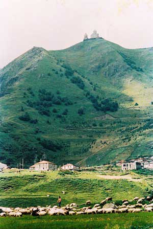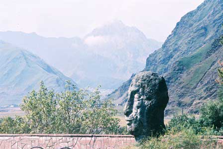 オルジョニキッゼからトビリシまでのコーカサス越えの道は「グルジア軍用道路」と呼ばれる。ロシア領内を抜けてグルジアに入ってほとんど初めての大きな集落がカズベキ。上の写真はカズベキの駐車場。その脇に奇妙な石づくりの顔があった。ここからカズベキ山のほうを見上げると、手前の小高い丘の頂きに石造りの教会があるのが見える。 (上2枚は1989年8月,左は1984年8月撮影)