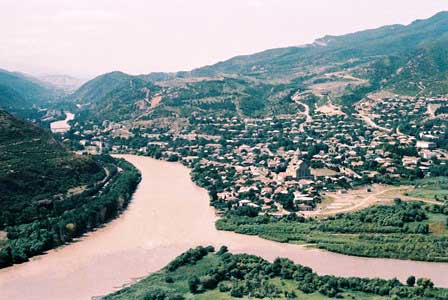 グルジア軍用道路を下ってトビリシに着く手前、アラグヴィ川とクラ川の合流点にある古都ムツヘタ。町から川を隔てた丘の頂きに石造りの教会があり、逆にその教会からムツヘタの町を俯瞰できる。 (左:2004年12月,右:1984年8月撮影)