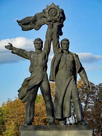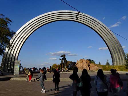 21世紀も10年代になるとウクライナとロシアとの関係がかなり険悪になったものだから、この碑ははたしてどうなってしまったのか気になっていて、久しぶりにキエフを訪れた時、旅程上のごく短い隙間の時間を利用して現地まで足を運んでみたら、倒されることなく建っていた。ただ、名称は「諸国民の友好のアーチ」と変わっていたが、「諸国民」にはロシアも含まれるだろうし.....。写真をよく見ると、上部に亀裂が入っているように見えるが、これはある活動家達のグループが稲妻形のシールを貼ったのだとか。碑を倒すのでなく名前を変えちゃうとか、事態が好転すればはがせるシールを貼るとか、キエフには智慧者がいるなぁと感心したものだった。アーチ以外の記念碑も無事だった。 (これより下:2019年9月撮影)