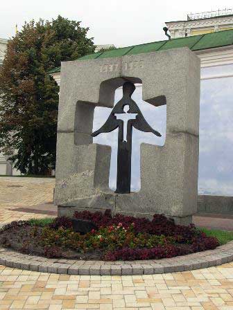 ミハイロフスカヤ広場に新しく建てられていた慰霊碑。ウクライナでは1930年代スターリンの強制的な「農業集団化」によって多くの犠牲者が出たが、その人たちを追悼するもの。 (2003年8月撮影)