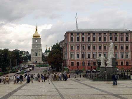 ドニエプル河を見下ろす川岸の“ウラヂーミルの丘”公園のすぐ上にある再建されたミハイロフ修道院前の広場。前方はソフィア寺院。 (2003年8月撮影)