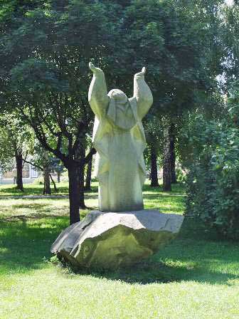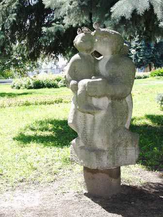 “ウラヂーミルの丘”公園で見かけた石像。母子像に雀の一家がとまっているのが何となくユーモラスに感じられた。 (2003年8月撮影)