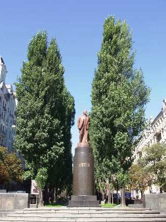 並木道の入り口に今でも立つレーニン像。台座の「レーニン」の文字はウクライナ語。 (2003年8月撮影)