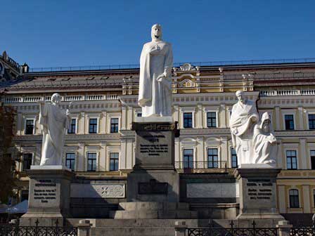 同じくミハイロフスカヤ広場に建てられた碑。キエフの守護神とされる聖オリガは、キエフ大公国第二代大公イーゴリ1世の妃。夫が殺された後、コンスタチノープルにおもむいてそこで東方正教会の洗礼を受けた。ロシア(ルーシ)で最初期のキリスト教改宗者であり、彼女の孫にあたるウラジーミル大公がキリスト教を国教とした。 (2019年9月撮影)