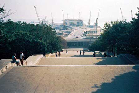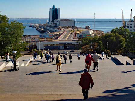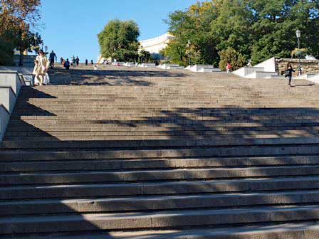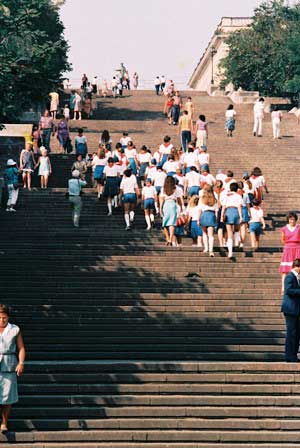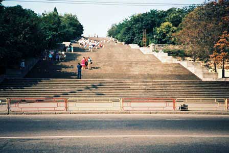 海港の波止場から市街へ入る階段が映画『戦艦ポチョムキン』で有名な場所。この階段、上から見ると踊り場しか見えず、下から見上げると踊り場が見えないという設計になっている。 (上:1985年8月,下:2019年9月撮影)