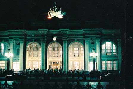 鉄道駅の駅舎。宿泊したホテルから近かったので夜出かけてみたのだが、シャッターを押す直前に照明を落とされて暗い写真になってしまった。 (1985年8月撮影)