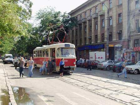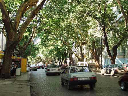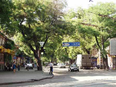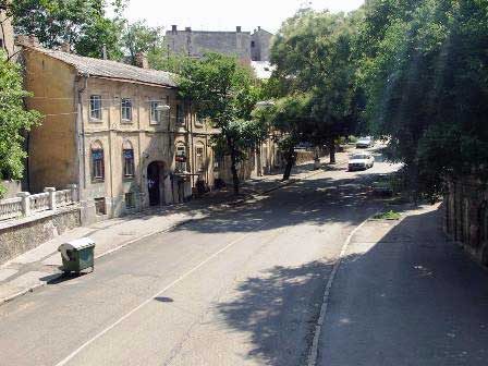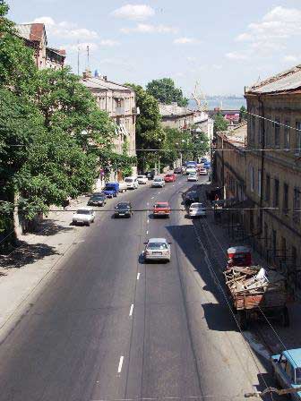 オデッサの町の通りの風景。右の2枚は港町らしい坂道。左側中下段の2枚は道路に覆い被さるような並木。左最下段の写真は鉄道駅と港を結ぶメインストリートの一つ。 (2003年8月撮影)