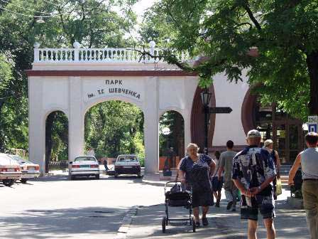 客船用桟橋からそれほどは遠くないところに、広大なシェフチェンコ公園がある。横浜の“港の見える丘公園”のように、その一角から港を見渡すこともできる。左上の写真は公園の入口ゲート。右上は、園内で見かけた石造りのアーチ。そばには大砲も置かれていたが、いったい何だろう?