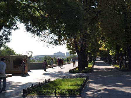 ポチョムキンの階段を上がると、海沿いに走る美しい並木道がある。プロムナード用の小径で、横浜港で言うと山下公園だろうが、全体に樹木がかぶさるような雰囲気は山下公園にはない。 (上:2003年8月,下:2019年9月撮影)