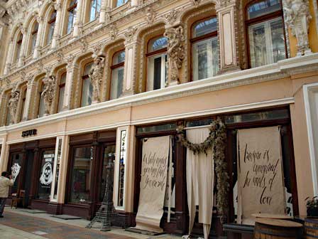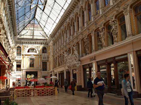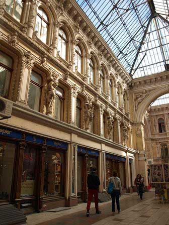 屋根付きのアーケード。2階部分の外面に並び立つ彫刻がセールスポイントらしい。 (2019年9月撮影)