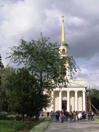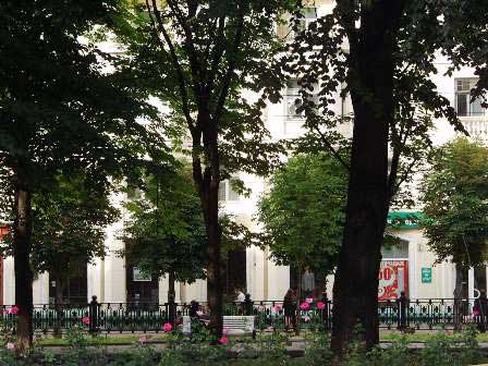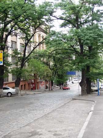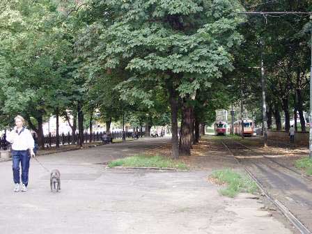 ドニエプル川中流の大工業都市ドニエプロペトロフスクの繁華街カール・マルクス通り。繁華街なのにそれらしい雰囲気が写真に感じられないのはなぜかというと、通りの中央分離帯にいるから。中央分離帯は、幅広の遊歩道と市電の線路から成り、それだけで立派な並木道になっている。その分離帯の外側に上下方向の自動車道があり、さらにその外側に通常の歩道があるという構造だった。 (2003年8月撮影)