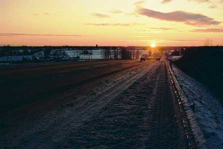 道路も林を切り開いてほぼまっすぐに伸びる。影の長さから夕暮れの近いことがわかる。 (1995年1月撮影)