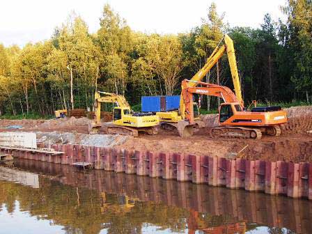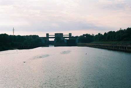 左の写真は、うち捨てられた廃船に草木が進出して川岸と渾然一体となっている様子。右は、運河の拡幅工事なのか閘門の整備事業なのかわからないけれど、運河の岸で行われていた土木工事。 (2009年8月撮影)