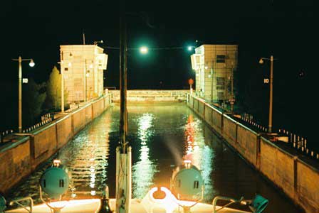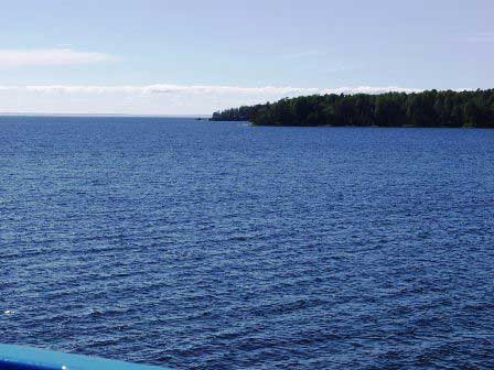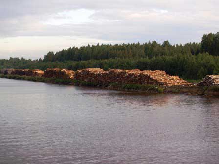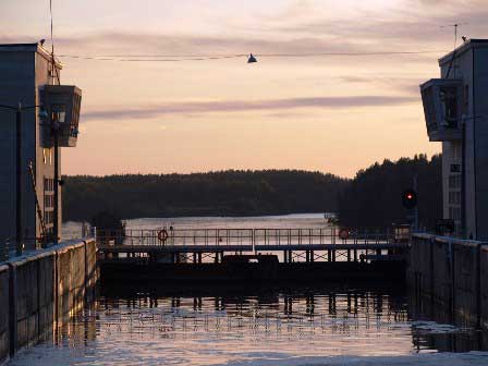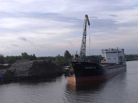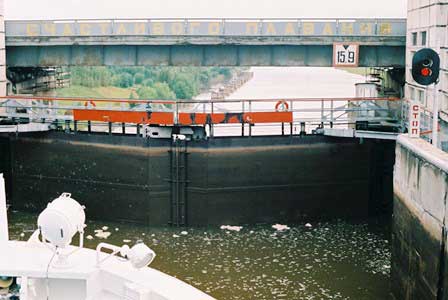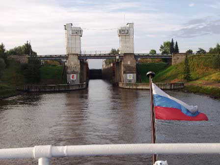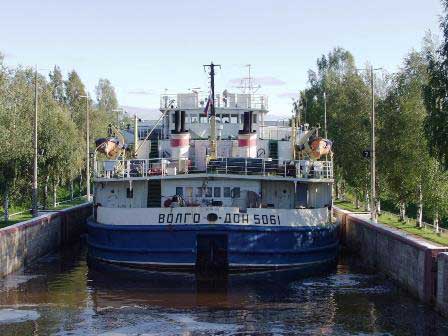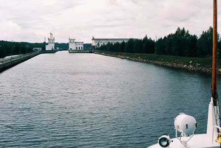 ヴォルガ川のリビンスクから北へ進むのがヴォルガ・バルト運河。ベロエ湖を経てオネガ湖と結ばれる。運河なのでヴォルガ本流に比べると水路の幅が狭い。その後スヴィリ川、ネヴァ川を経てサンクト・ペテルブルクに至る水運の大動脈でもある。水位を調整する水門が途中に何ヶ所もあるもはヴォルガ川と同じ。昼夜をわかたず仕事があるのは陸上交通や航空業務と同じで輸送業の宿命か? (上:1995年8月,下:2009年8月撮影)