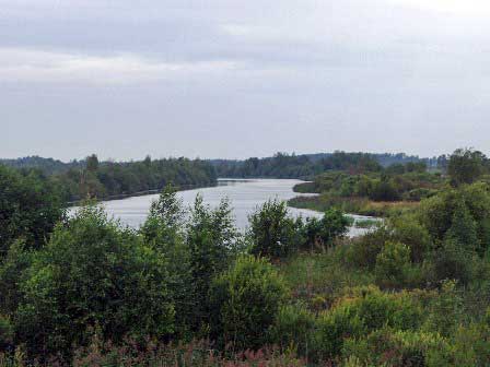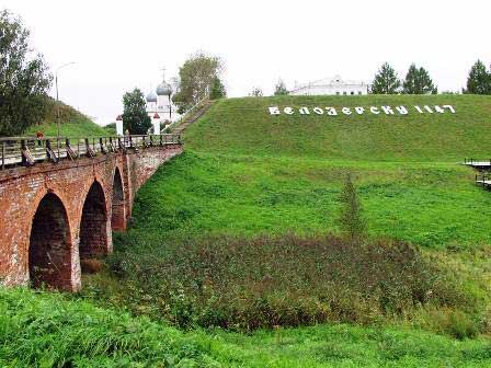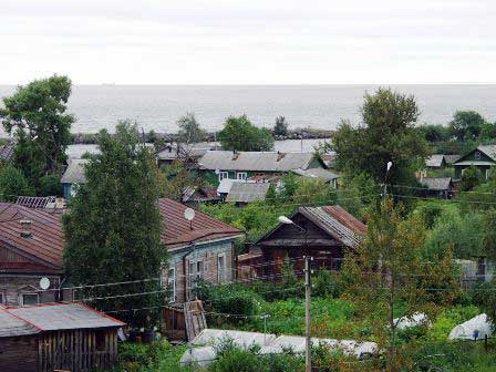 ヴォログダ州、ベーロエ湖の南岸に位置する小さな町。写真は、クレムリンの土塁から湖の方向を眺めたもの。 (2009年8月撮影)