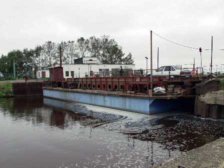 上段は、ベーロエ湖から船着き場に進む水路と船着き場(河港)に停泊している客船。下段は水路の途中にかかる浮き橋。船が通る時に開くようになっている。 (2009年8月撮影)