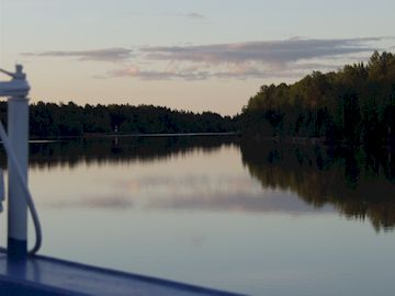 ヴォルガ・バルト水路の分水嶺にあたるあたり。川幅が狭くなり、船も速度を落としてゆっくりと進む。 (2005年8月撮影)